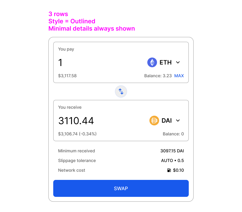On the second field (the one where you choose the token you are swapping to) you can also include the price impact next to the fiat currency amount, by calculating the difference between the input amount and estimated output amounts. This is quite a useful detail to include.
