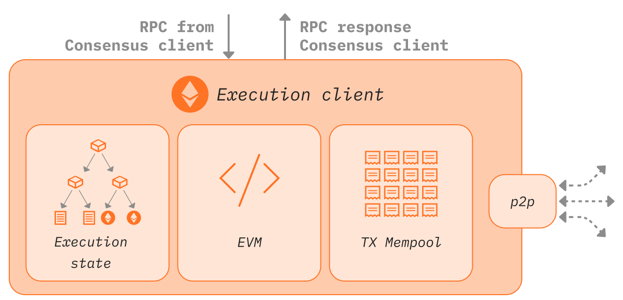 - The execution layer executes the transactions and validates the state in the block header (i.e., checks hashes match)